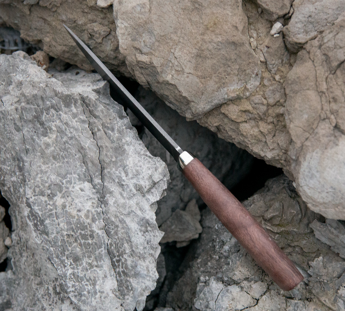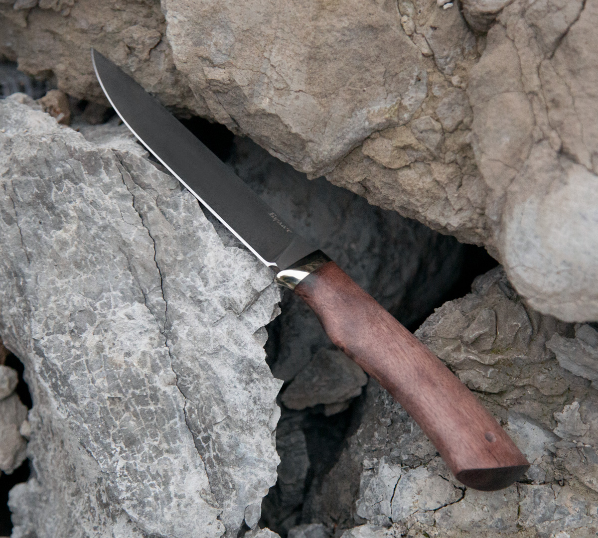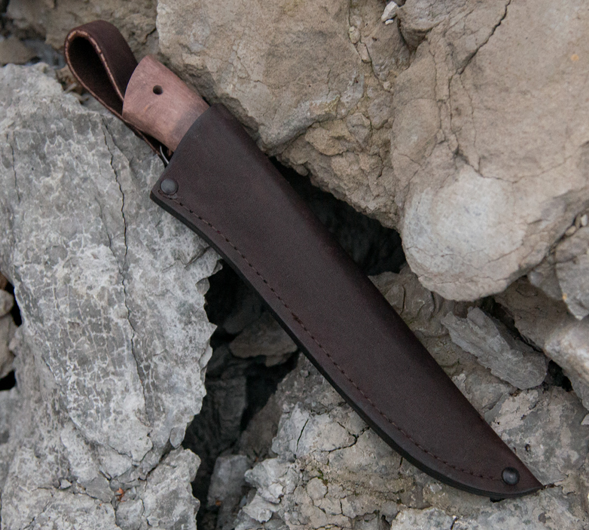 Нож Ладья из булатной стали, рукоять - стабилизированная карельская береза, кожаный чехол идет в кммплекте.